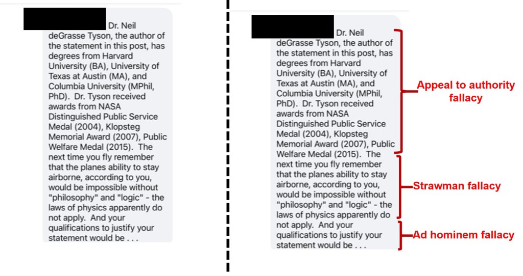 Today is going to focus on being able to spot, address, and substantiate one’s argument. Let me set the stage first. The picture posted above is what fueled this topic. Dr Tyson is a fairly well known and popular expert when it comes to science. A friend of mine from college shared this picture, and I recognized flawed thinking within the claim and addressed it. What follows is pushback from a complete stranger to me, but an acquaintance to my friend. This exchange took place a couple weeks ago, and I decided to tip my hat to Tim Barnett’s Red Pen Logic[1] approach to break down the retorts I received and highlight where some additional flawed thinking was applied.