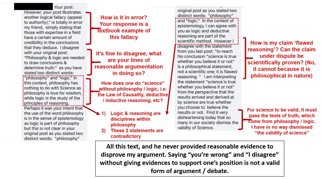 Here’s where I draw on Red Pen Logic in my approach to visually breaking down the issues in the responses (I initially identified three logical fallacies in play—there may be more but I will focus on the three I addressed in the online debate). First, you can see that a list of academic and professional accomplishments for Dr. Tyson was provided. This is an example of the “appeal to authority” fallacy[3]; I will pause to note that the claim Dr. Tyson has an MPhil (Masters of Philosophy) from Columbia University I only find mention on his Wikipedia[4] page. The website The Famous People[5] lists that he obtained a Doctorate in Philosophy in Astrophysics. However, Biography[6], Britannica[7], and other sites have no mention of this degree. Dr. Tyson may well have this degree, however he is not known for his work in philosophy. Rather, his expertise, writing, speaking engagements, and media interviews regard the area of astrophysics. A number of Christian apologists have made the same criticism as I have in books, articles, and on podcasts (and to that end I might be challenged for appealing to authority, too). Another note—people with a number of degrees are still capable of making illogical / nonsensical claims; there are many people with college degrees who demonstrate a lack of knowledge and wisdom. Richard Dawkins believes there is no God. John Lennox believes there is. Both of them have doctorate degrees and based on the Law of Non-Contradiction, one of them is wrong.